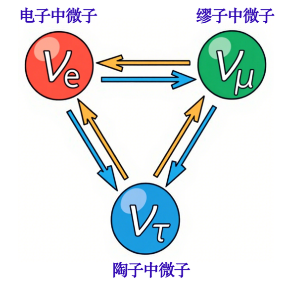 中微子有三种“味”——电子中微子、μ子中微子和τ子中微子。这里的“味”并不是指真正的味道,我们可以简单将其理解为物理学家给不同类型中微子起的名字。神奇的是,一个电子中微子在飞行过程中可能突然“变身”成μ子中微子,这种变化被称为中微子振荡,是量子力学世界特有的奇妙现象。
