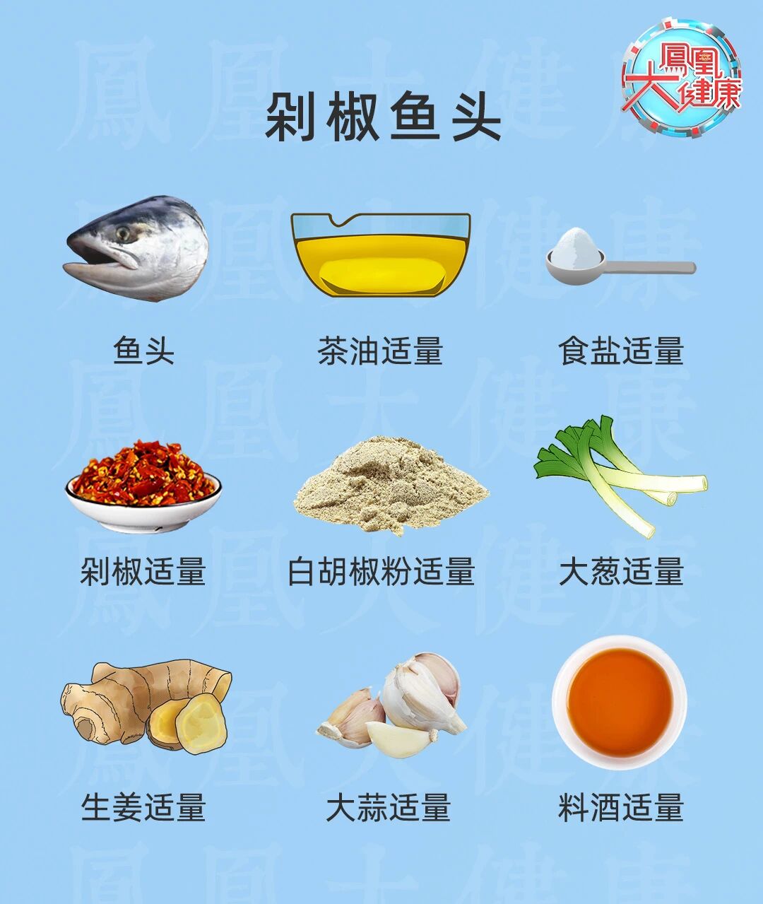 【用料】鱼头,茶油、食盐、剁椒、白胡椒粉、大葱、生姜、大蒜、料酒各适量。【做法】1、将鱼头清洗干净,用刀剖开鱼嘴,使鱼头能平整展开;2、放入料酒、食盐、胡椒粉腌制半个小时去掉腥味;3、将切好的姜片、葱丝平铺在盘底,放上腌制好的鱼头;4、在鱼头上铺满剁椒,放入锅中隔水蒸至鱼头熟;5、将生姜、大葱、大蒜切成末,撒在蒸好的鱼头上;6、锅内倒入适量的茶油烧热后,浇在葱姜末上即可。
