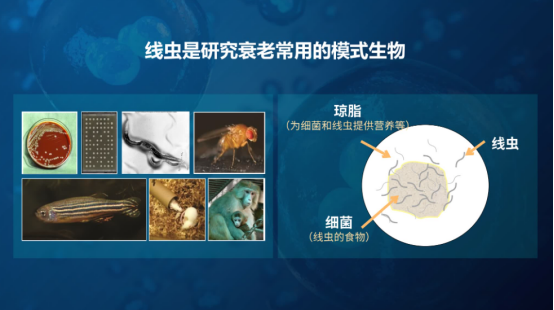秀丽线虫是研究衰老的理想模型,原因主要有两点:第一,它的生命周期仅20 天左右,如果科学家想测试某种方法是否能延长线虫的寿命,大约一个月就能得出实验结果。但如果用小鼠做实验,则需要等待两三年才能得到一次实验结果,耗时过长。