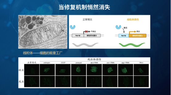 令人惊讶的是,我们观察发现:当幼虫接触到各种线粒体抑制剂,造成线粒体损伤后,能够启动修复机制,身上的绿色荧光很快就会变亮。但一旦线虫进入成虫期,即便线粒体同样受到损伤,细胞却毫无反应——既不启动修复,也不发出荧光,仿佛主动放弃了“自救”。