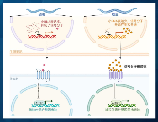 我们发现,在幼虫期,线虫体内会产生大量小 RNA ,这些小 RNA 能够抑制一种特定信号分子的表达。随着线虫进入成虫期,小 RNA 的表达量急剧减少,原本被抑制的信号分子开始大量出现。这些信号分子从线虫的生殖细胞释放出来,传递到体细胞内,最终关闭了线粒体的保护与修复机制。而虫卵中富含这种小 RNA ,因此喂食虫卵裂解液,能让成年线虫重新恢复线粒体修复能力。