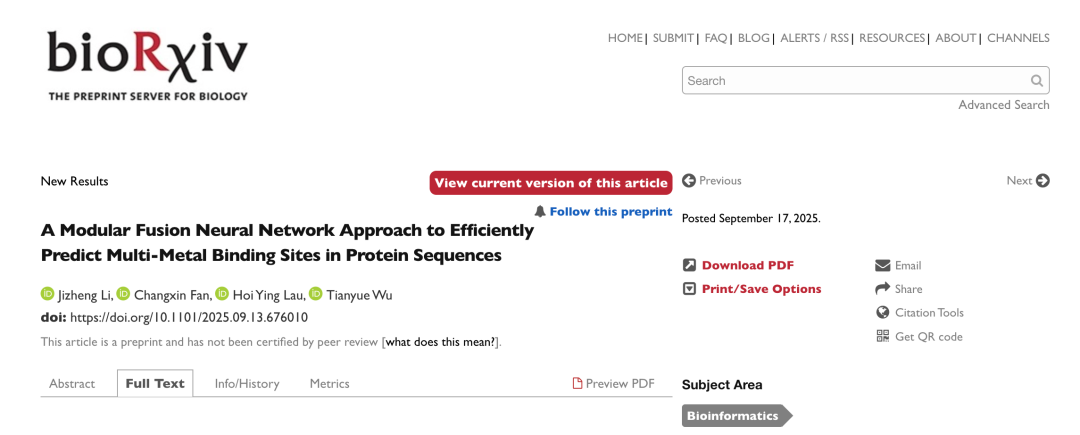 相关研究以「A Modular Fusion Neural Network Approach to Efficiently Predict Multi-Metal Binding Sites in Protein Sequences」为题,发表于 bioRxiv。