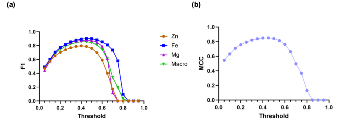 下图(a),展示了每种金属和宏观平均 F1 分数与决策阈值 τ 的关系。结果显示 Fe 的预测表现出色,当 τ 值在 0.25 到 0.60 之间时,F1 分数超过 0.81。Zn 与 Mg 的单金属模型在 τ = 0.25–0.50 和 0.25–0.60 区间,F1 分数也均超过 0.79。整体而言,当阈值设定在 0.40–0.45 时,宏平均 F1 分数达到峰值 0.855,为平衡所有金属于精确度和召回率的最优选择。图(b)给出的 MCC 与阈值的关系曲线,也进一步表明了在严重类别不平衡的情况下,框架仍然能够实现良好平衡。