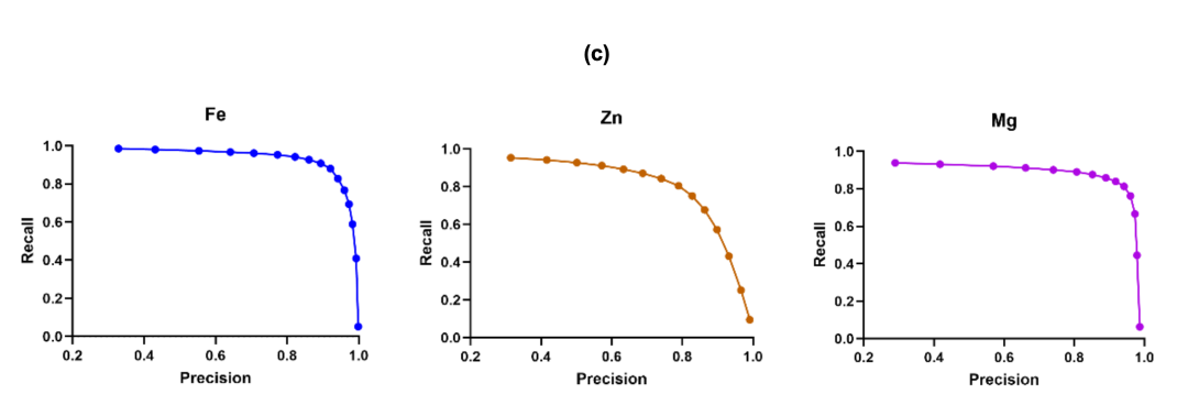 图(c)展示了三类金属的精确率-召回率曲线,Fe 的预测在较高召回率水平下依旧保持较高的精确率,说明能适用于全面的位点筛选。Zn 和 Mg 的预测指数也表现较为良好,表明了该框架对于需要中等高召回率和持续精确率应用,具有良好的鲁棒性。