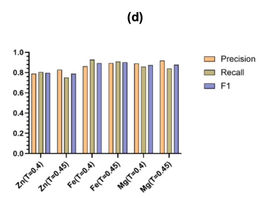 最后,图(d)展示了在 τ = 0.40 与 0.45 这两个最佳阈值下,不同金属预测的精确率、召回率与 F1 分数。结果可见,该框架能够针对不同金属的特点实现灵活调节,既可用于覆盖率优先的筛查场景,也能满足高精度的实验验证需求。