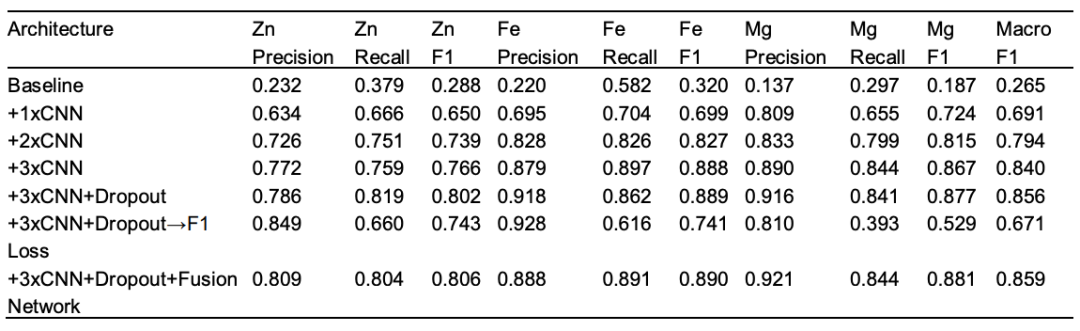 从最基础的单个 CNN 层出发平均 F1 仅为 0.265,随着卷积层数的增加性能显著提升,三层 CNN 将平均 F1 提升至 0.840,验证了分层特征提取的关键作用。引入 Dropout 后 F1 升至 0.856,防止了过度拟合并提高泛化能力。针对类别不平衡问题,研究团队设计的加权二元交叉熵损失函数,在不牺牲整体精度的情况下显著提升了召回率。最后加入融合层,平均 F1 再提升至 0.859,同时融合层有效地模拟了金属间的依赖关系,提高了残基水平预测的准确性和鲁棒性。