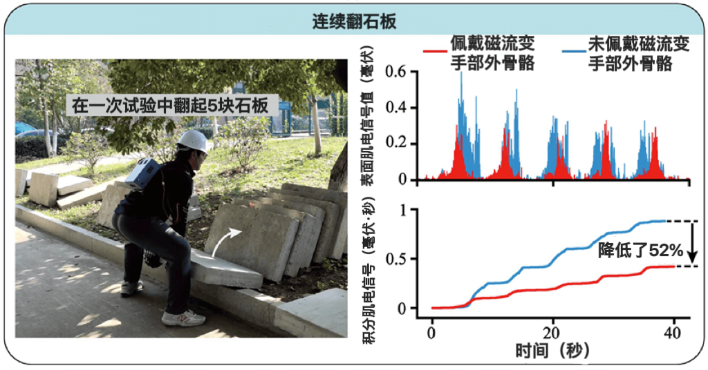 当实验者戴上它,原本需要多人合力才能搬动的200公斤石板,一个人就能轻松翻起;在单杠上的悬挂时间从不到两分钟延长到近三分钟;连续搬运重物时的肌肉疲劳感大幅降低。这不是科幻电影中的道具,而是中国科学技术大学特任教授孙帅帅课题组与合作者联合研发的,基于磁流变技术的手部外骨骼系统。