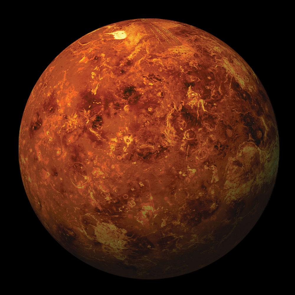 接着,往下来到金星地表,一切都会变得暖烘烘。酷热的高温可达摄氏数百度,甚至连铅都会被融化──你绝不会想在毫无保护的状况下往低处冒险。往下探索金星表面,你会发现有许多和地球类似的地质特征,像是巨大的峡谷、火山,甚至是古老的熔岩流。