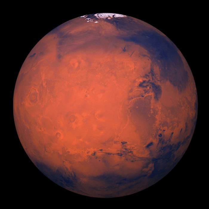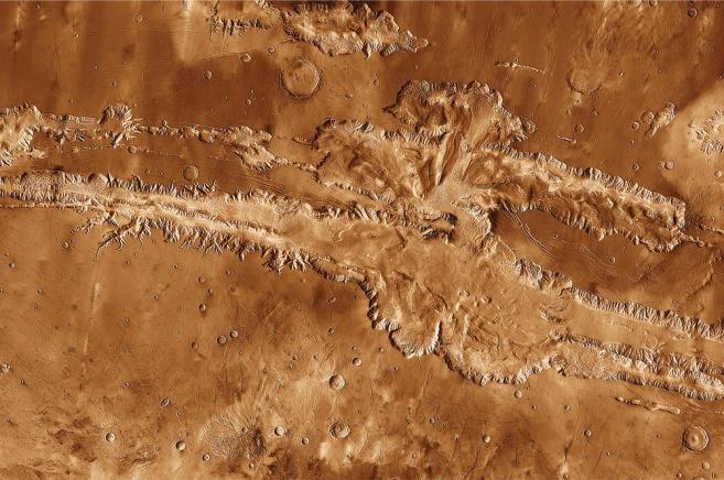 除此之外,火星还有横跨赤道的巨大峡谷:水手号谷( Valles Marineris )。它有4000公里长,几乎是大峡谷的十倍,这也让它成为太阳系最大的峡谷。