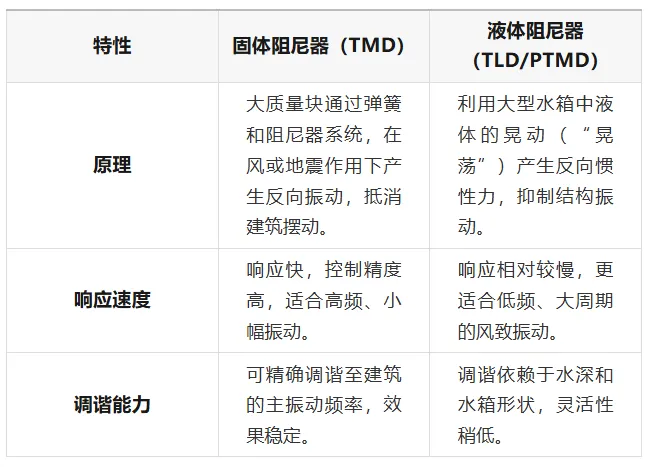 结论:对风振控制要求高、结构刚度变化复杂的建筑(如上海中心),倾向于使用固体阻尼器;而对大周期风振、空间受限或需多功能集成的建筑(如广州塔),液体阻尼器更具优势。