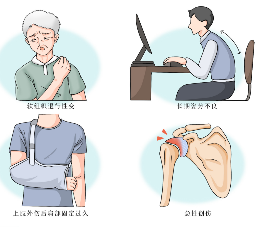 • 糖尿病患者发病风险增高3倍,甲状腺疾病患者及长期肩部制动者易发。