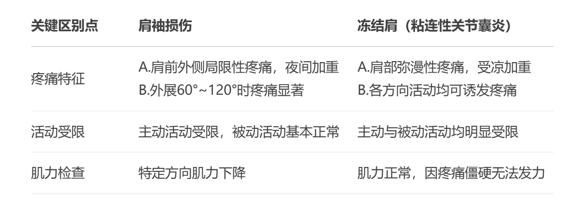 ·特定方向肌力减退(关键鉴别点!):外展无力(冈上肌损伤);外旋/内旋无力(冈下肌/肩胛下肌损伤)。