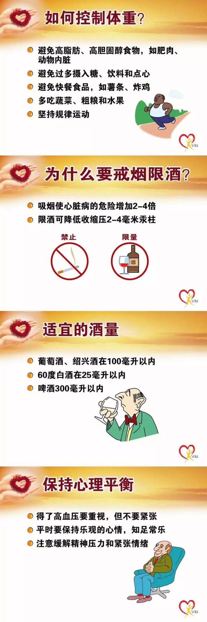 限制酒精和香烟:酒精会让心跳加快、血管收缩,还影响药效。少量喝酒活血对高血压患者不适用,若实在要喝,必须限量:男性每天酒精≤25克,女性≤15克,别空腹喝,喝酒时别吃太咸太油的菜。此外,必须戒烟,尼古丁会让血管收缩、血压骤升,还损害血管内皮,导致动脉硬化。不管烟龄多久都要戒,别吸二手烟。