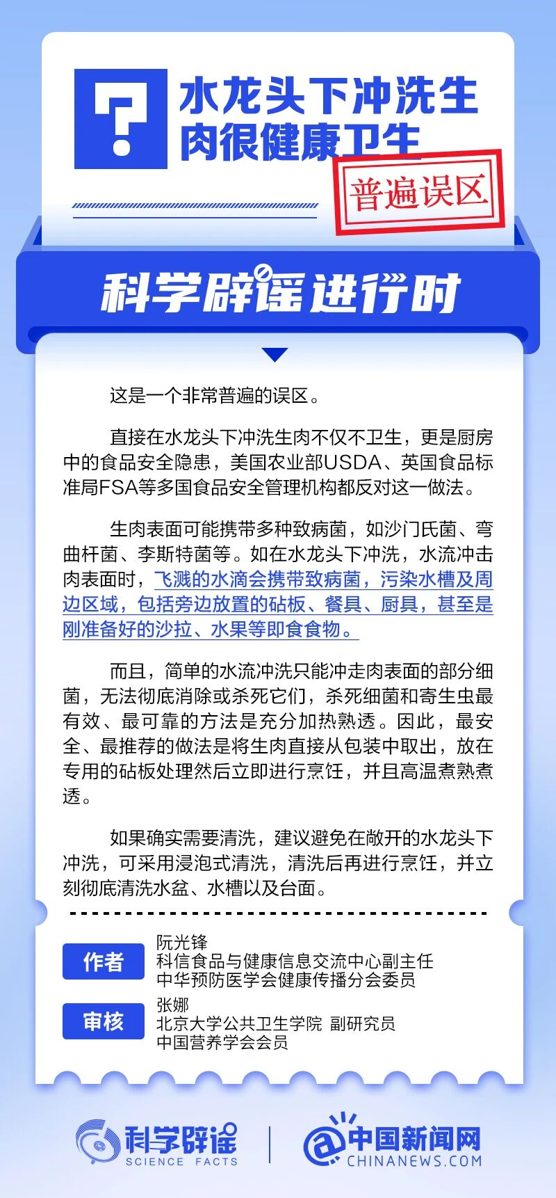 图文简介: 直接在水龙头下冲洗生肉不仅不卫生,更是厨房中的食品安全隐患,美国农业部USDA、英国食品标准局FSA等多国食品安全管理机构都反对这一做法。