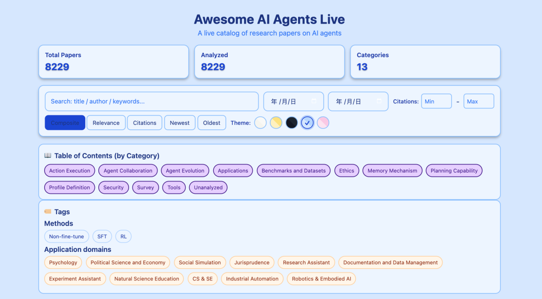 基于这一困境,华东师范大学上海人工智能金融学院的大三学生邹丛远及其辅导教师吴宗翰,开发了一款名为「Awesome AI Agents Live」的轻量级平台,为研究人员、工程师和学生提供了一个实时更新的论文目录,帮助他们更高效地把握 AI Agent 领域的最新进展。