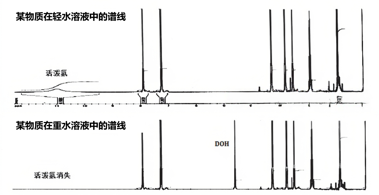 某物质在轻水和重水溶液中的核磁共振氢谱对比