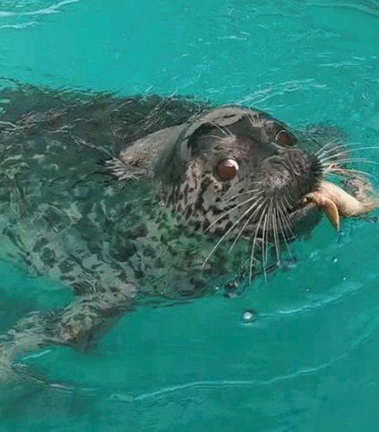 刚开始接触到小零食的斑海豹它是很好奇的,它会用鼻子来试探,来闻这个气味,到后来会一点点撕咬和吞咽,激发它们的味蕾。