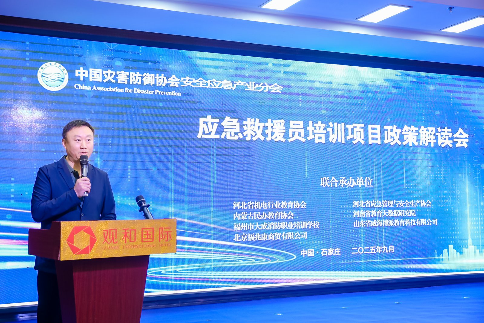 2025年9月27日,由河北省机电行业教育协会、河北省应急管理和安全生产协会、内蒙古民办教育协会、河南省教育大数据研究院、福州市大成消防职业培训学校、北京福兆康商贸有限公司、山东省威海博派教育科技有限公司等多家单位联合承办的“应急救援员培训项目政策解读会”在石家庄观和国际酒店举行。