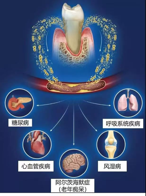 口腔中的细菌悄悄从牙龈的破损处入侵血液系统,炎症反应会导致血管内皮损伤,血栓形成和动脉粥样硬化。因此,牙周炎患者发生心肌梗死、脑卒中、感染性心内膜炎的风险显著增加。