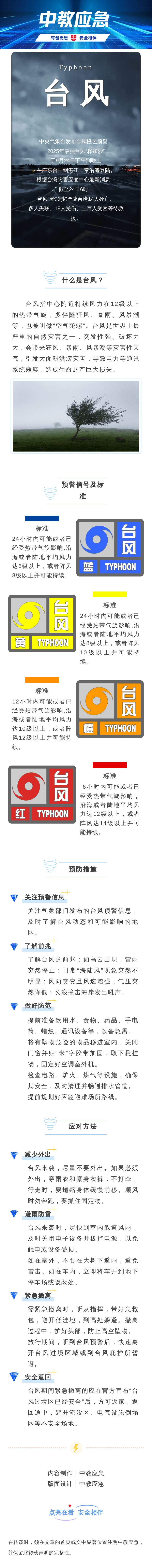 图文简介: 台风指中心附近持续风力在12级以上的热带气旋,多伴随狂风、暴雨、风暴潮等,也被叫做“空气陀螺”。生活中遇到台风后如何安全避险,让我们来看下正确的避险方法。