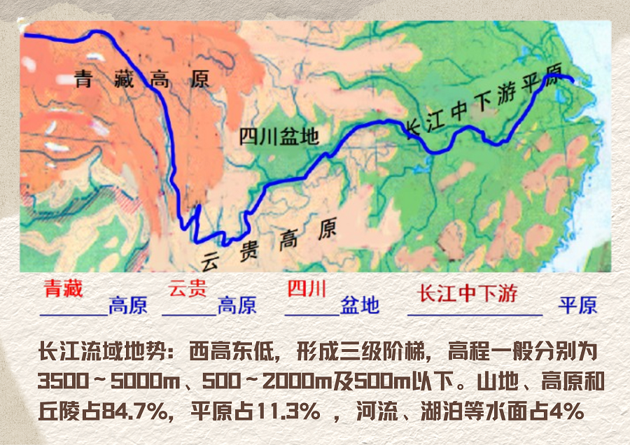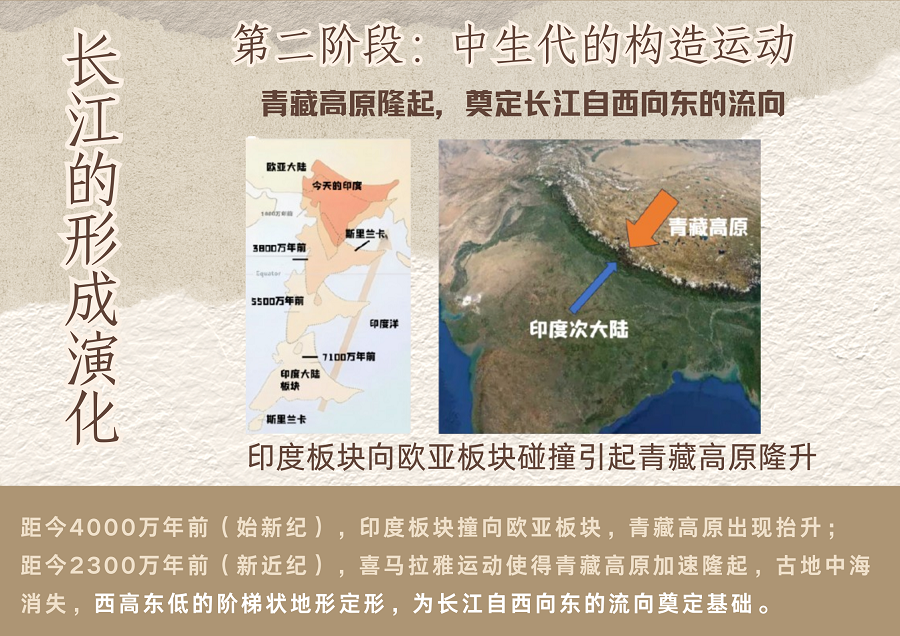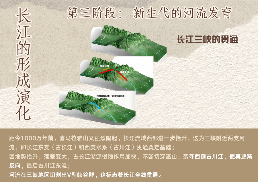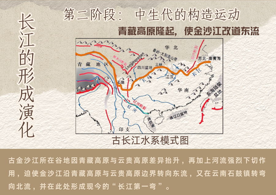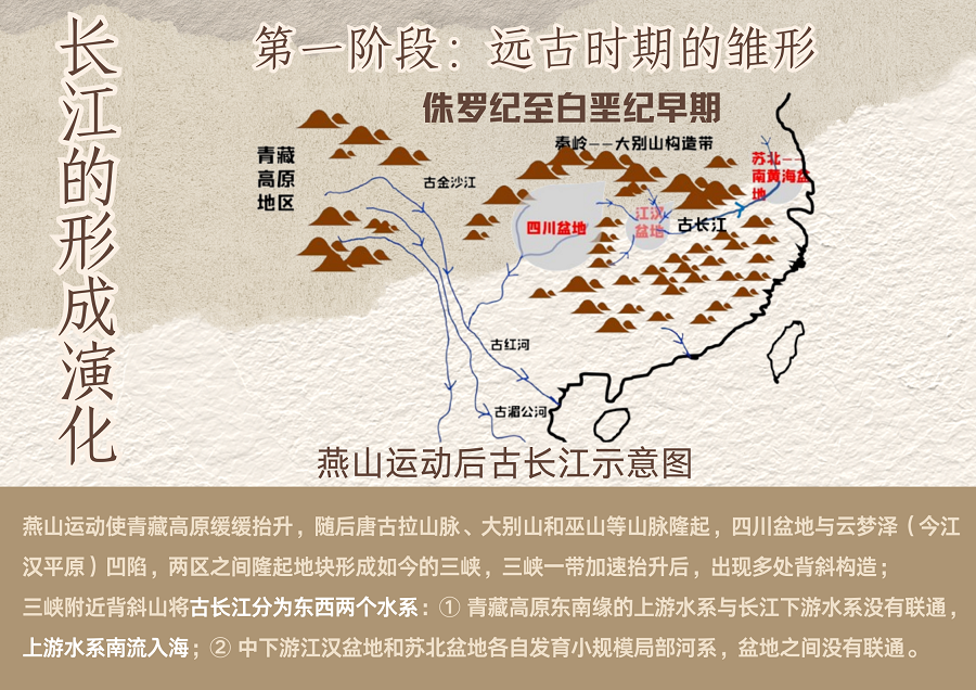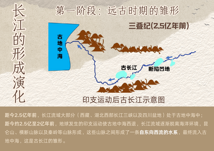 7000万年前:地壳运动使我分化为两条独立水系:西长江向南注入印度洋,东长江东流太平洋