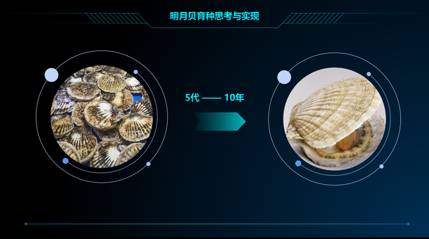 扇贝2年成熟,国家要求是5代以上才能达到一个稳定的遗传,我们花了10年把这个白壳色的扇贝培育成了一个新的品种,我们叫它“明月贝”。“明月贝”比较抗高温,生长速度快,出肉率高。