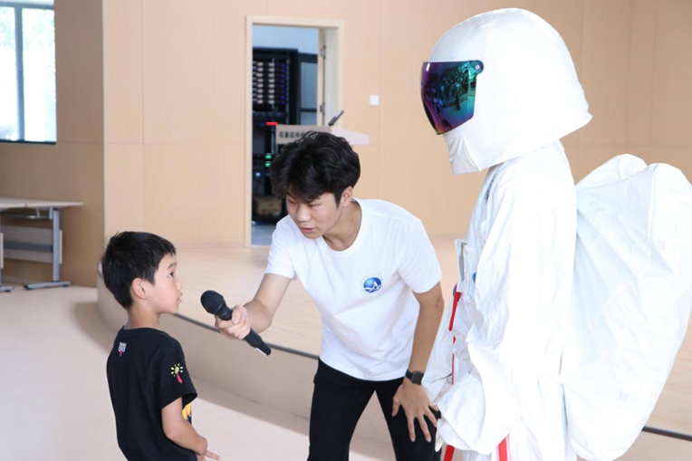 宣讲团成员以“航天探索的追梦征程”为脉络,用航天老照片、火箭发射动画片段与童趣化讲解搭建“星际漫游通道”。“看,这是东方红一号卫星在太空的模样,它就像一颗闪耀的‘中国星’,开启了我们国家的航天纪元呢!”宣讲员指着PPT里的航天影像,从“火箭为什么能飞天”的趣味提问,到“宇航员在太空怎么睡觉”的生动解答;从用“吸管喷水”类比火箭推进原理,到展示航天模型时孩子们争先恐后触摸的雀跃场景,一个个鲜活的航天故事让“遥远太空”变成了孩子们眼中“触手可及的奇妙乐园”。台下不时响起“原来太空这么有趣呀”的惊呼,航天梦想在互动中悄然在孩子们心底萌芽。“为什么宇航服是白色的?”讲解员从光学反射角度释疑,并拆解宇航服“保护、保障、通讯”三大核心功能。现场,科技大学学生身着宇航服登台,讲解员随机提问各部件作用,学生们踊跃上台答题,答对者获得“宇航员小气球”,零距离感受航天科技的严谨与神奇。