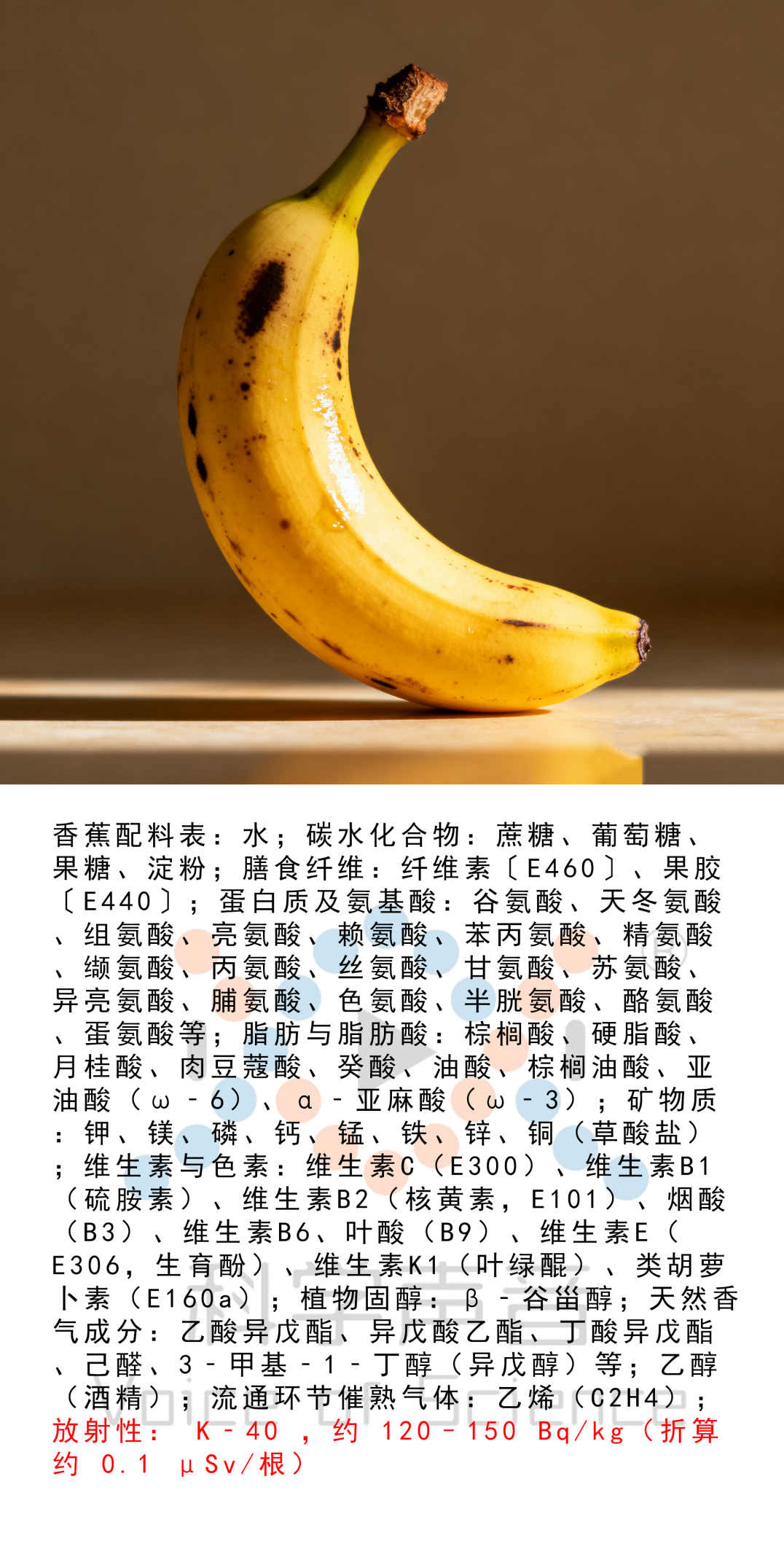 怎么样,上面这个“配料表”看上去是不是“很不干净”?尤其注意,因为含钾-40这种放射性同位素,香蕉的辐射剂量比大多数水果都要高。是不是很可怕?难道香蕉不安全了吗?当然不是,香蕉非常安全。