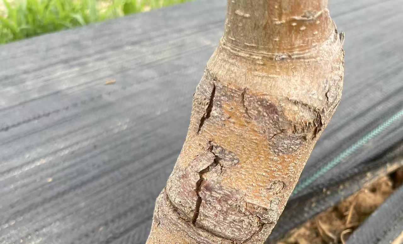 在旱塬区栽培时发现,当树势偏弱或过于干旱时,G935砧木段容易感染枝干病害,如轮纹病或干腐病,具体症状为冒褐色油水,表皮干死。