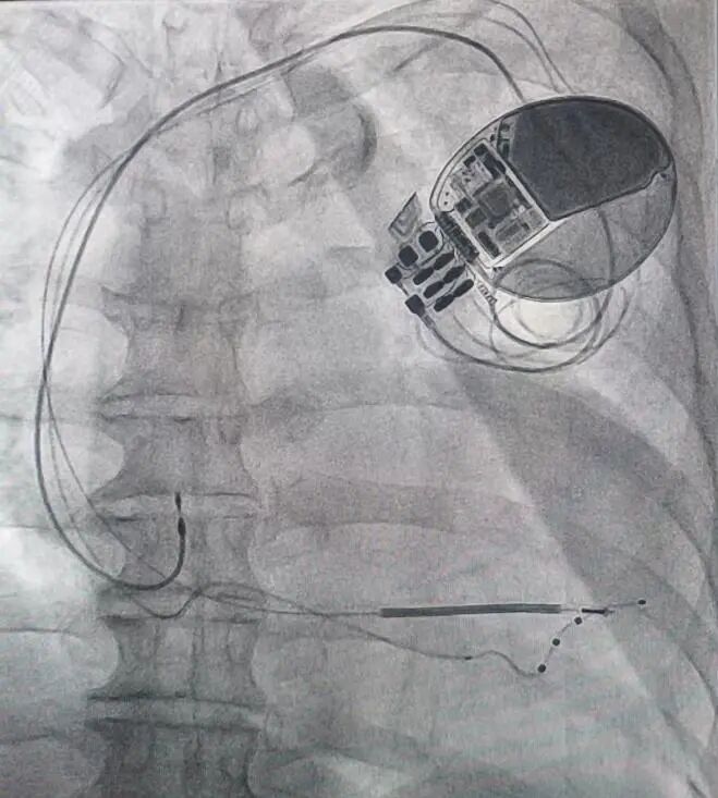 这一手术在起搏领域难度系数极高,需要操作者熟练掌握起搏器植入技术及冠脉诊疗技术。心血管内科二病区团队凭借丰富的临床经验与精湛技术,通过腋静脉穿刺,将三根电极精准植入右心房、右心室及左心室侧壁,耗时2小时完成设备植入。