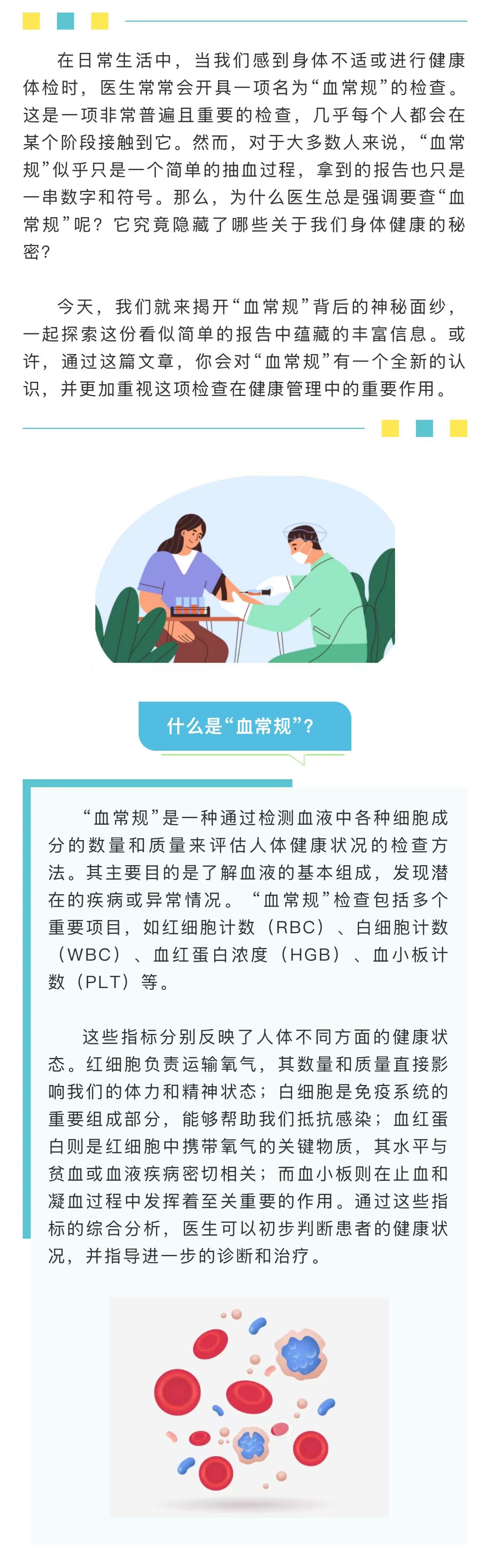 图文简介: 在日常生活中,当我们感到身体不适或进行健康体检时,医生常常会开具一项名为“血常规”的检查。今天,我们就来揭开“血常规”背后的神秘面纱,一起探索这份看似简单的报告中蕴藏的丰富信息。