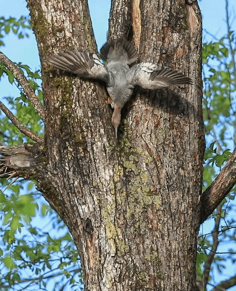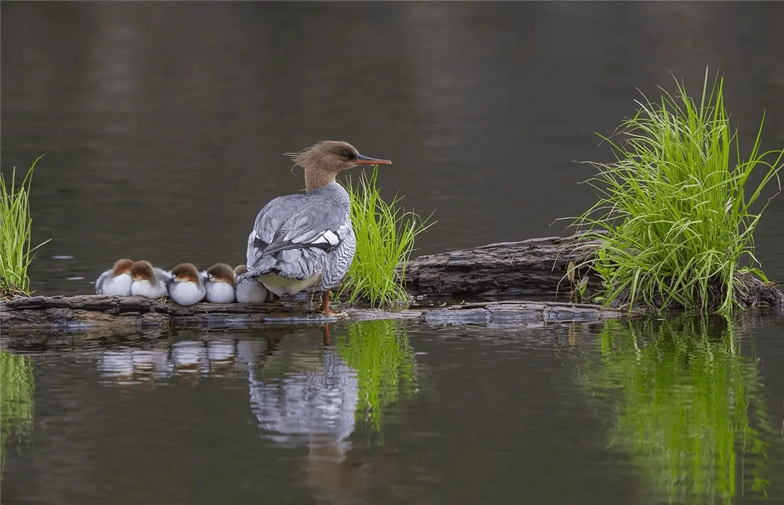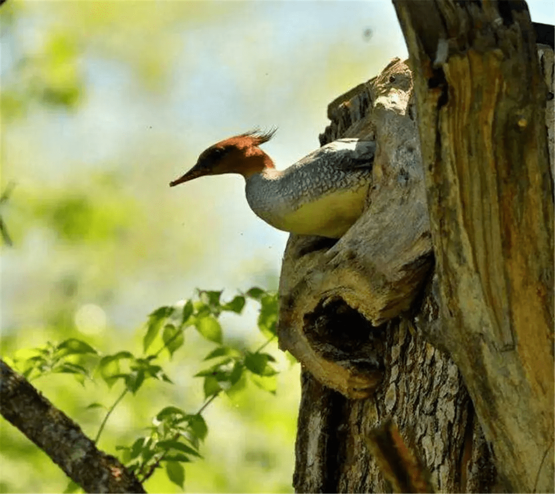 中华秋沙鸭非常漂亮,周身布满如祥云般的花纹,整个身体看起来像是一幅水墨丹青画。它们种群数量非常稀少,比大熊猫还要濒危,是我国一级保护动物。为了躲避天敌威胁、确保蛋能安全孵化,它们通常将巢筑在十多米高的树洞里。从鸭宝宝破壳开始,出壳后的它便在母鸭身下度过48小时左右。这段时间,鸭宝宝的羽毛变干、逐渐强壮。一切万事俱备,母鸭便准备带领鸭宝宝们跳巢离开,去往一个新的生活环境。