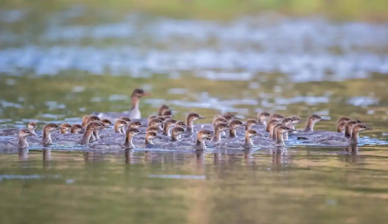 待所有鸭宝宝均成功跳巢后,母鸭便带领它们沿着溪流蜿蜒前行,开启觅食之旅。