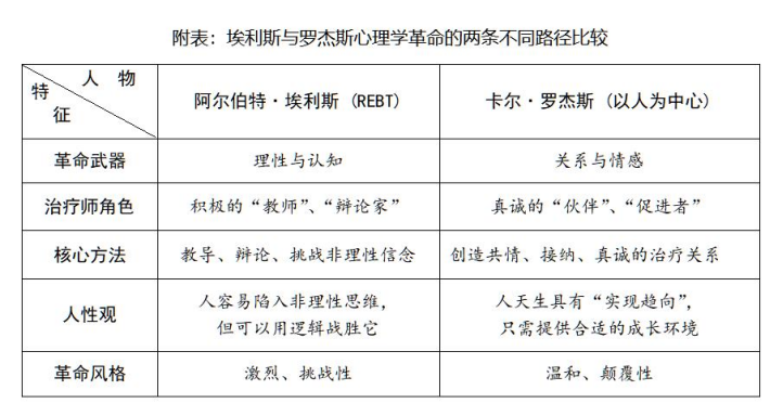 将埃利斯与罗杰斯并列,我们能清晰地看到心理学革命的两条不同路径(附表)。