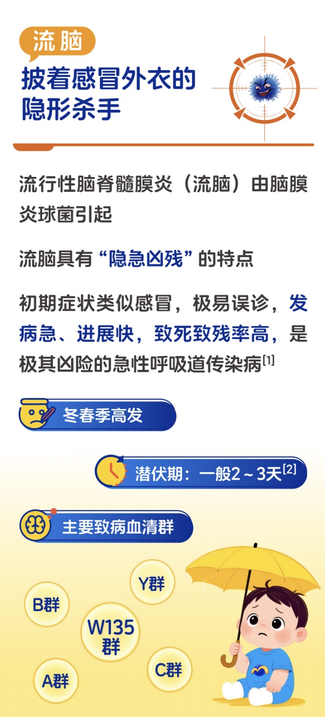 流脑,是一种由脑膜炎奈瑟菌感染而引起的急性化脓性脑膜炎,属我国法定乙类传染病。流脑具有“隐急凶残”的特点,发病急、进展快、病死率高、致残率高。其传播极具隐蔽性,从类似感冒的症状发展到脓毒性休克、多器官衰竭可能仅数小时,幸存者还可能面临脑损伤、听力丧失等严重后遗症,因此预防至关重要。