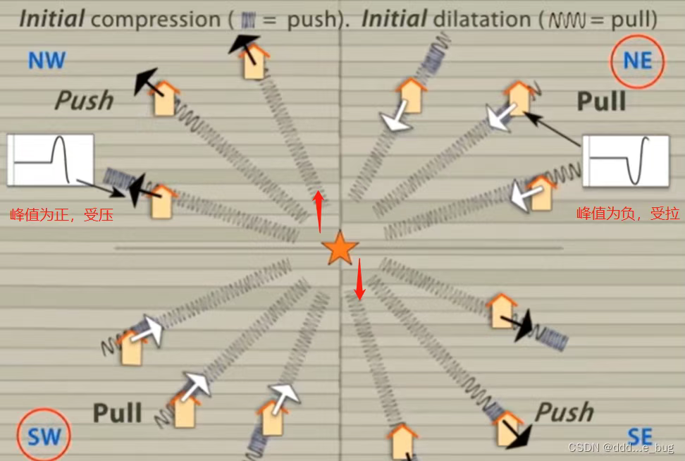 - 沙滩球图特征:阴影区(压缩区)和白色区(拉张区)交替分布,形成类似棋盘格的四分图形。