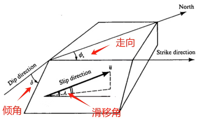 - 滑移角(Slip):滑动方向与断层倾斜方向的角度。
