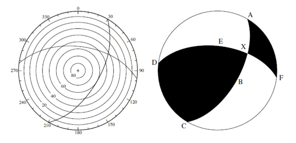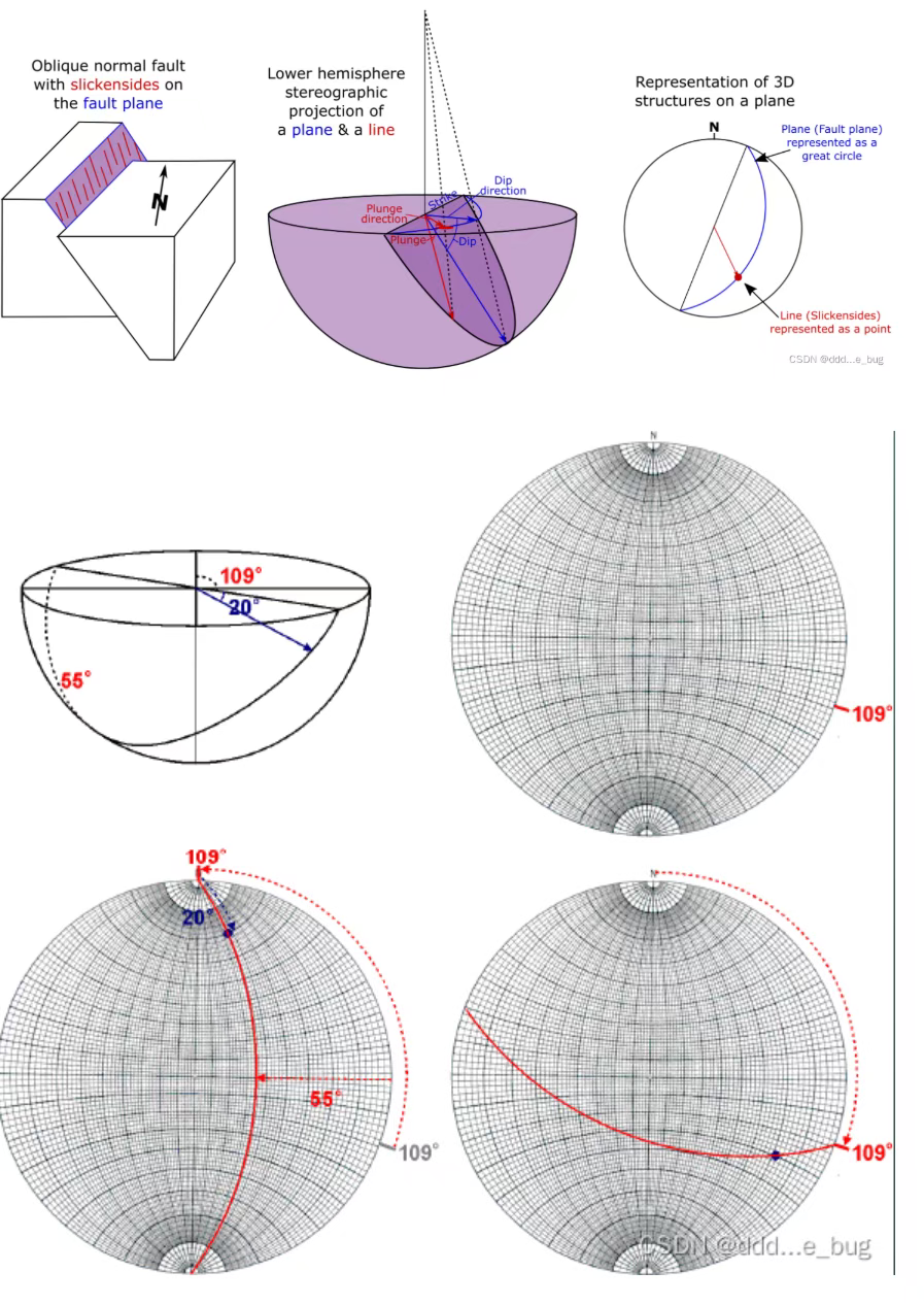 - 下半球投影:断层面和滑移方向以大圆弧和点的形式投影到下半球。