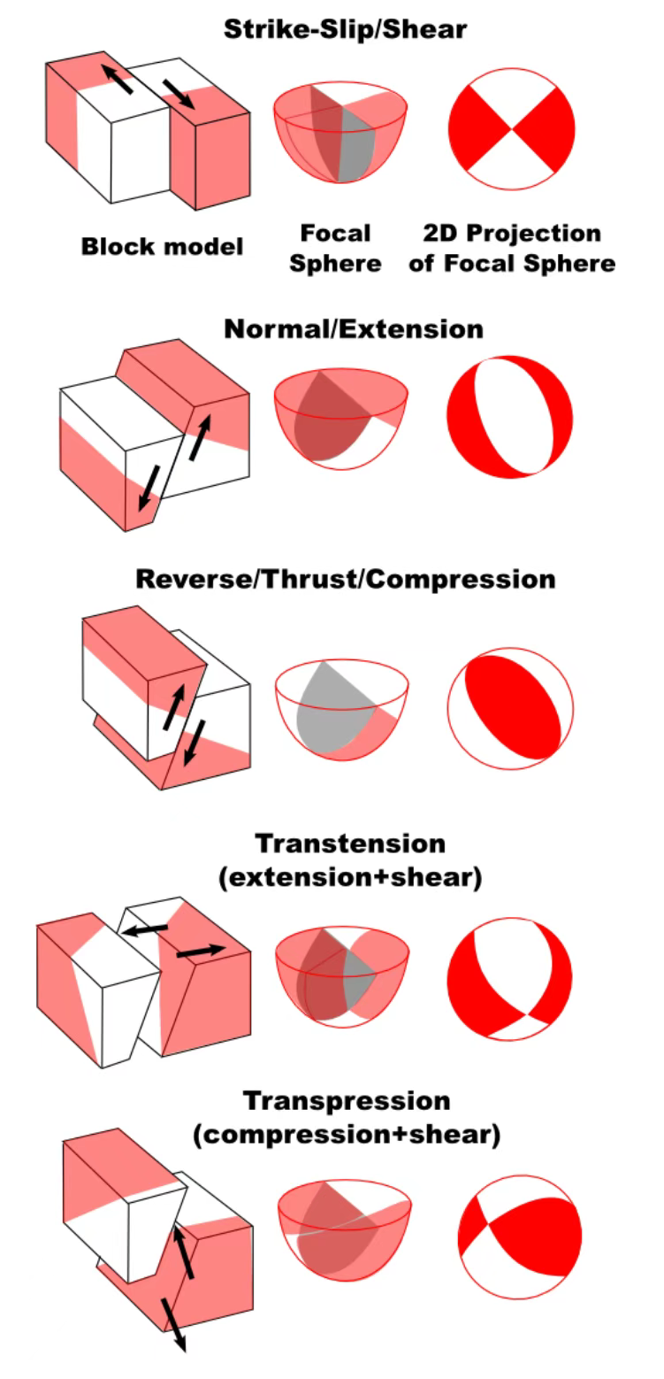 并结合了断层模型、震源球(Focal Sphere)和二维投影的沙滩球(2D Projection of Focal Sphere)。以下是详细的解读:1. Strike-Slip/Shear(横移断层/剪切断层)