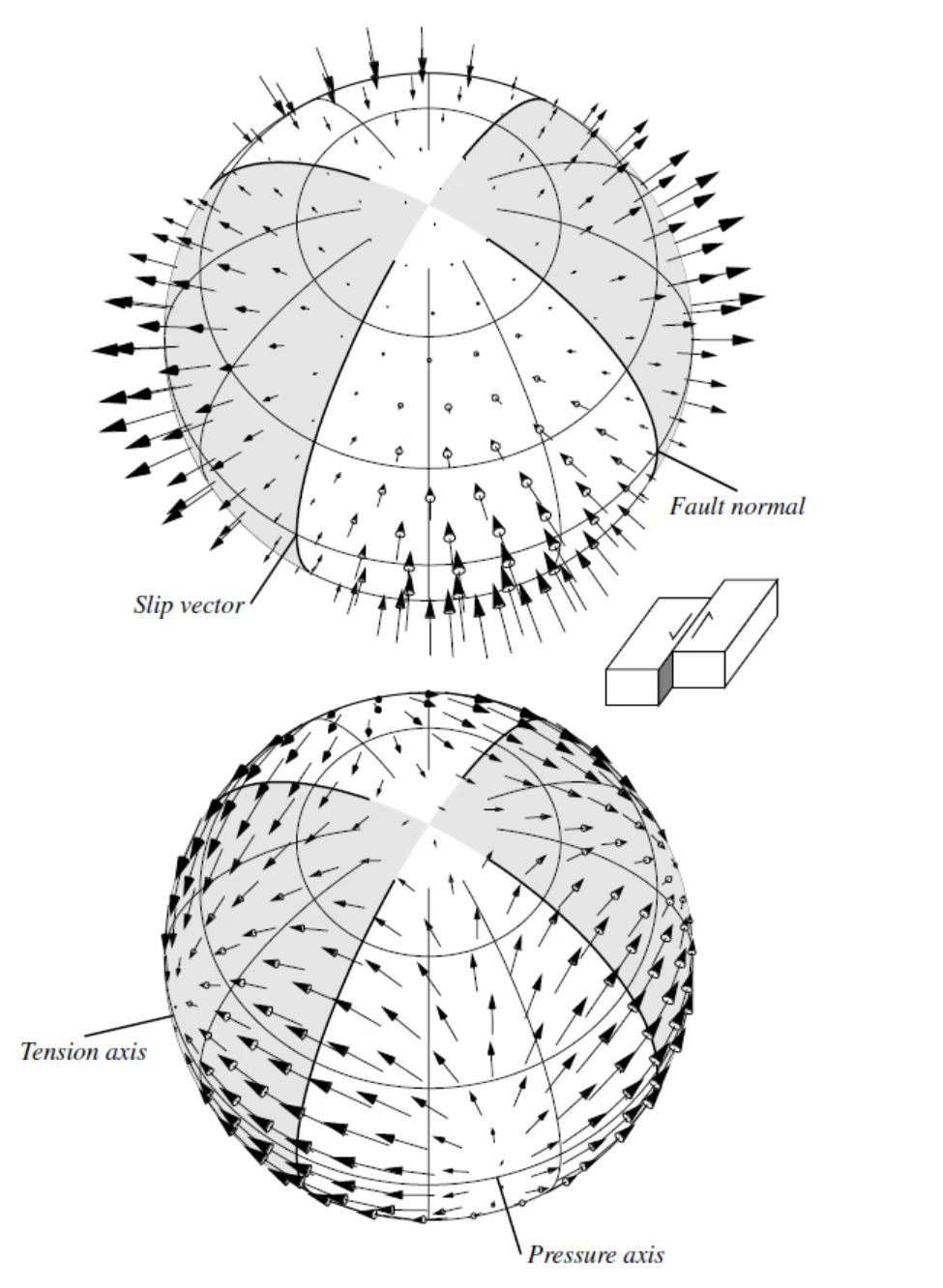 - 沙滩球图特征:拉张区(白色部分)位于球体的中央,压缩区(阴影部分)位于两端。表明断层面发生了垂直方向的张裂运动。
