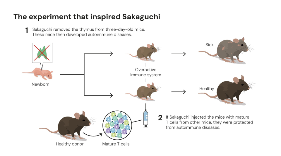 故事的起点在 1995 年。日本科学家坂口志文(Shimon Sakaguchi)教授通过精巧的实验发现,如果从小鼠体内去除一小群特殊的T细胞,这些小鼠就会患上严重的自身免疫病。而一旦把这群细胞输回去,疾病又会奇迹般地好转。这群细胞,就是 Treg。这是人类第一次明确,免疫系统里确实存在着一支专门负责“踩刹车”的部队。 这一发现,为整个领域奠定了基石。