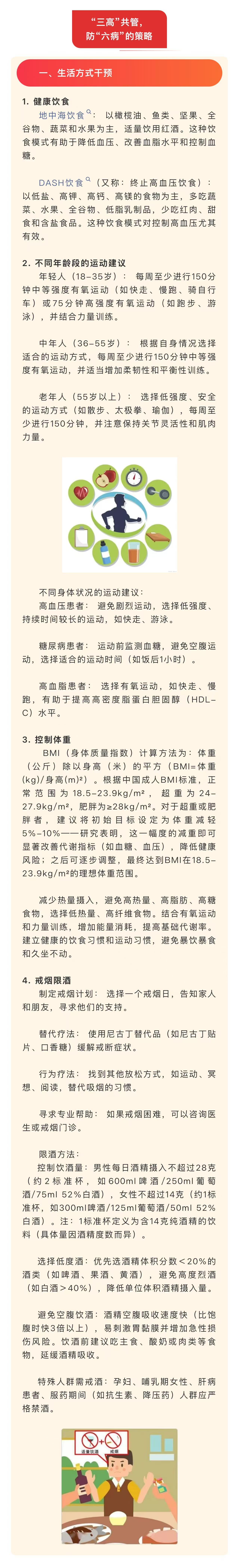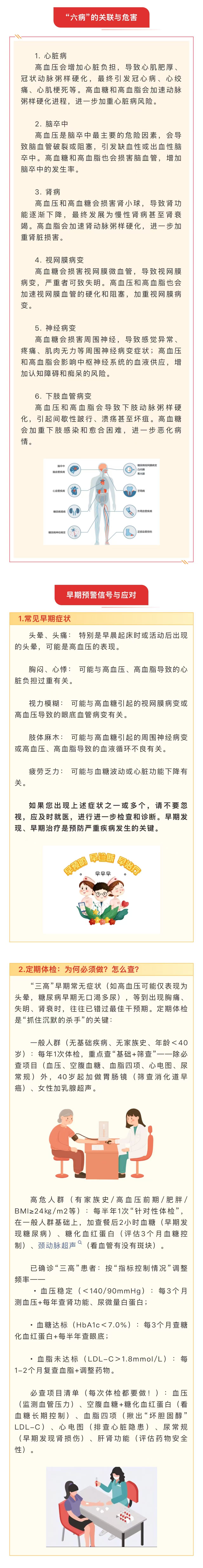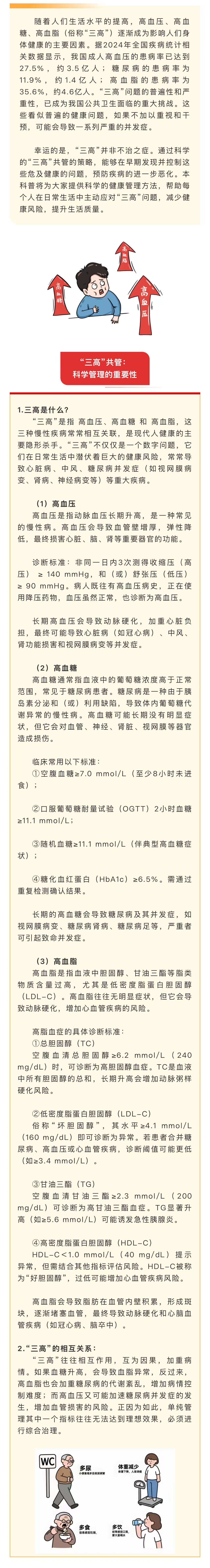 图文简介: 随着人们生活水平的提高,高血压、高血糖、高血脂(俗称“三高”)逐渐成为影响人们身体健康的主要因素。为大家提供科学的健康管理方法,帮助每个人在日常生活中主动应对“三高”问题,减少健康风险,提升生活质量。
