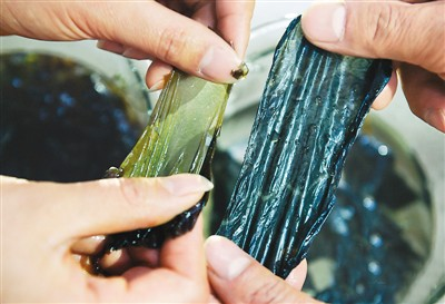 泡过水的紫菜(左)VS塑料袋(右)图源:新华社发 宋为伟摄
