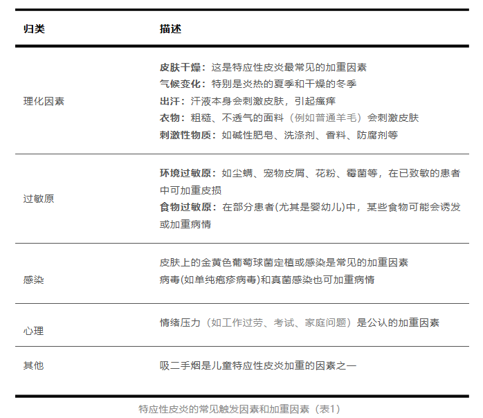 很多特应性皮炎患者饱受复发的困扰,一大部分原因是他们生活中有大量的疾病触发因素和加重因素。如下表。(不过,具体影响要因人而异。)