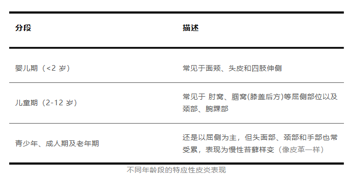 另外,特应性皮炎的表现和年龄也高度相关。下表总结了它的年龄分布特点。
