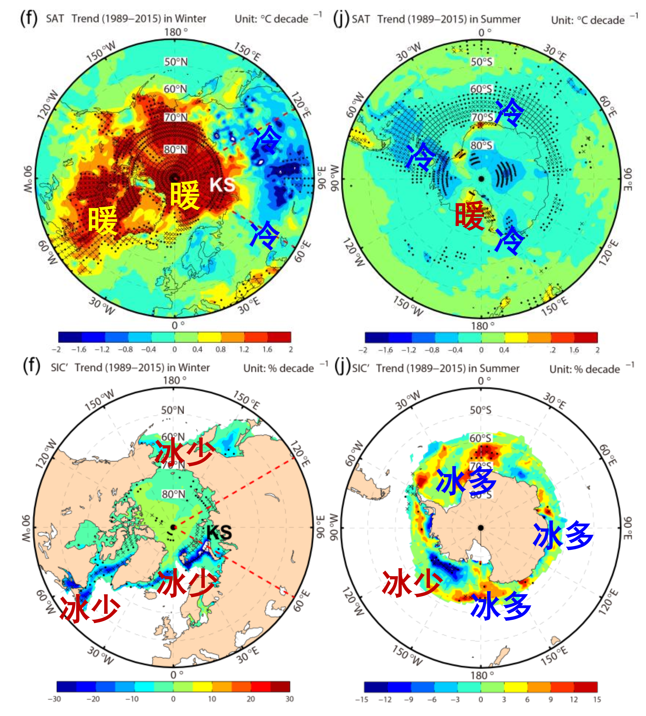 1989-2015 年,全球平均气温在上升,但南北两个半球的 “升温节奏” 完全不同:北半球的增温幅度远大于南半球,且冬季增温最显著,尤其是 60°N 以北的高纬度增温;而南半球 60°S 以南的南极大陆边缘海域,除了罗斯海局部增暖,其他区域均在降温。