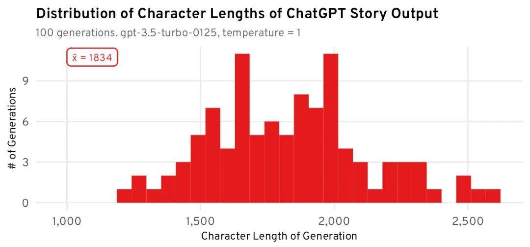 试验一共有三次,第一次是不做字数限制的情况下,AI 生成的故事的平均长度为 1834 个字符。