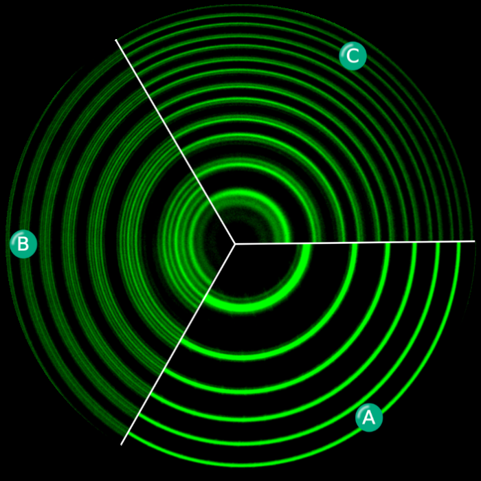 汞蒸气灯在546.1 nm波长处的光谱线显示出反常塞曼效应。(A) 没有磁场。(B-C) 在磁场作用下,谱线分裂为横向和纵向塞曼效应。
