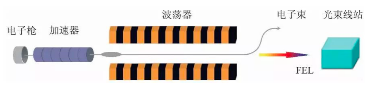 自由电子激光是利用接近光速的高能电子束,通过周期性磁场(波荡器)迫使电子振荡并辐射光波,在自放大自发辐射等机制下,光波与电子束相互作用,被相干放大,最终形成的高强度、高相干性的激光。X射线自由电子激光(XFEL)装置的核心是利用巨大的粒子加速器隧道产生X射线激光的过程。