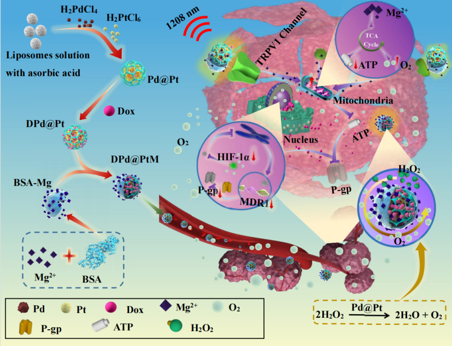 第一种纳米平台是光热驱动的双金属Pd@Pt纳米结构。该平台通过近红外二区的光热效应,精准激活TRPV1离子通道,让细胞外的镁离子这个“特殊信使”进入细胞,从而抑制细胞里的ATP产生,切断肿瘤耐药所需的能量供应,以此来逆转肿瘤对多种药物的抵抗(参考文献[2])。
